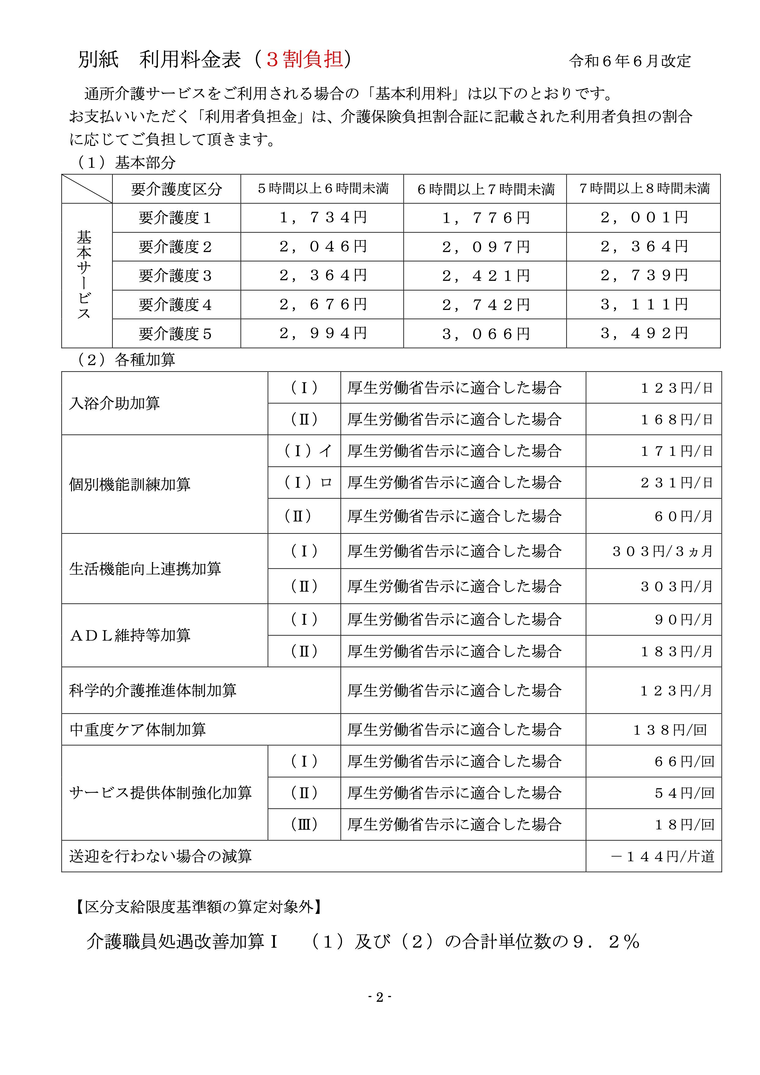 - →介護報酬告示上に額で、介護保険負担割合証に記載された利用者負担の割合に応じてご負担して頂きます。