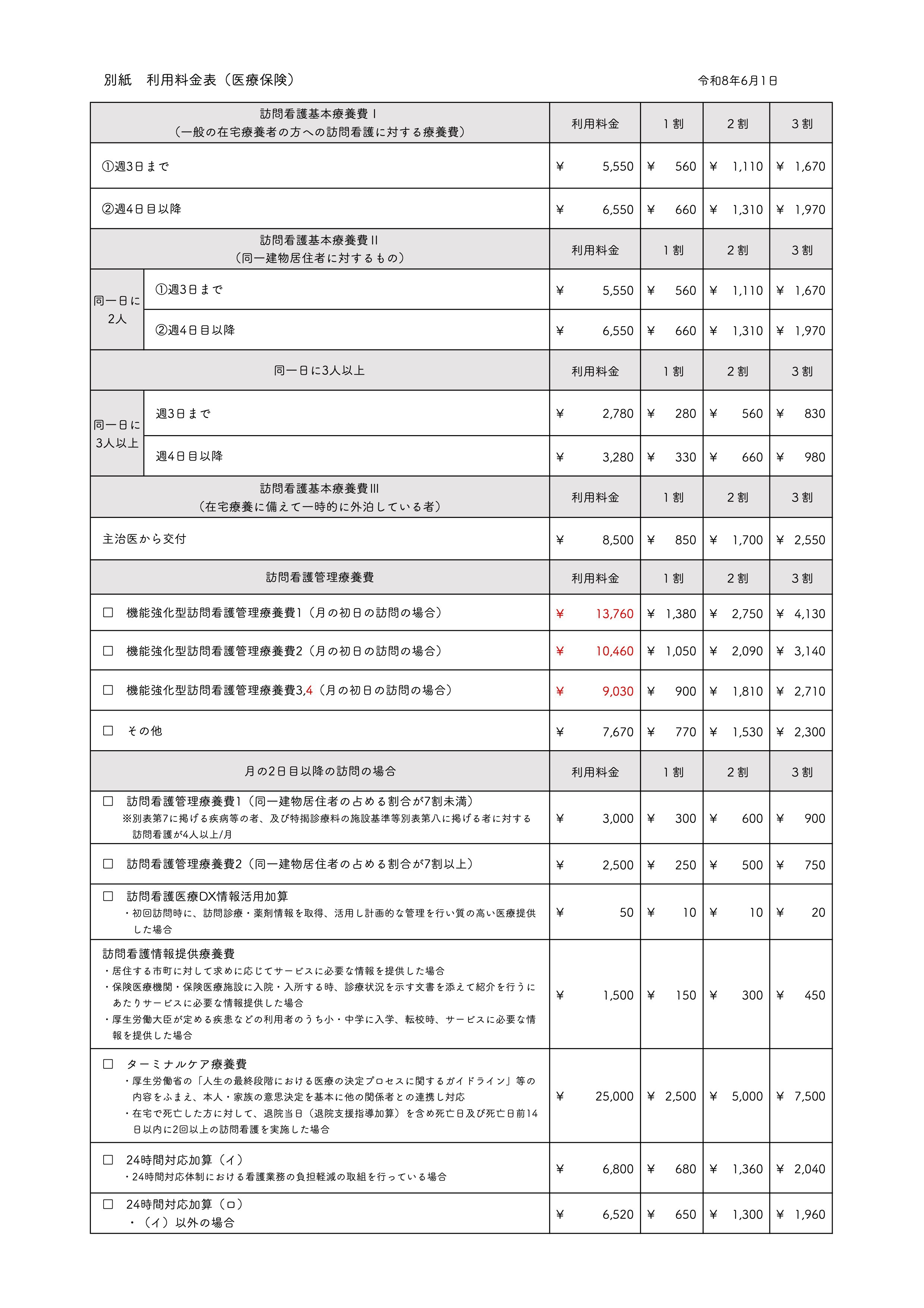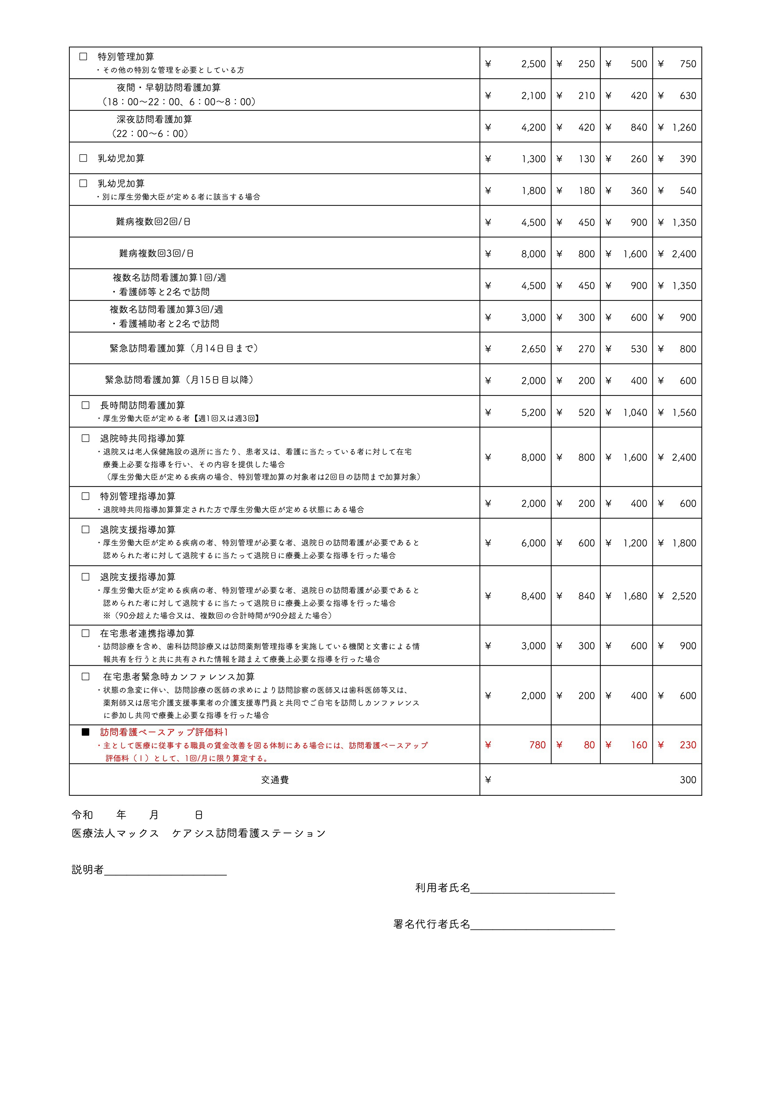 - また、訪問時点でのキャンセル等続いた場合には、事前に説明・同意を得た上で、キャンセル料として利用料金の10%(自己負担相当額)を頂く場合があります。