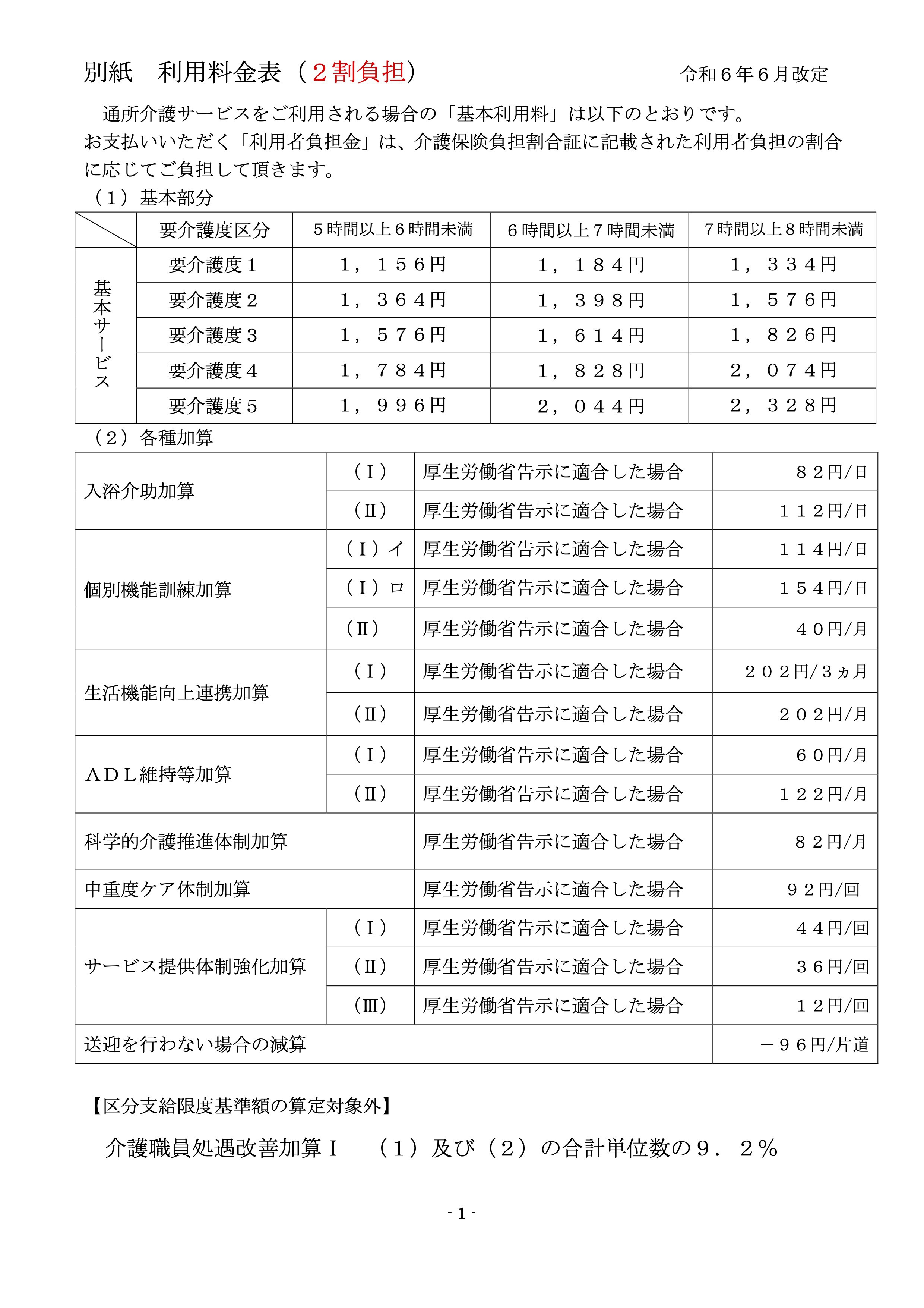 - →介護報酬告示上に額で、介護保険負担割合証に記載された利用者負担の割合に応じてご負担して頂きます。